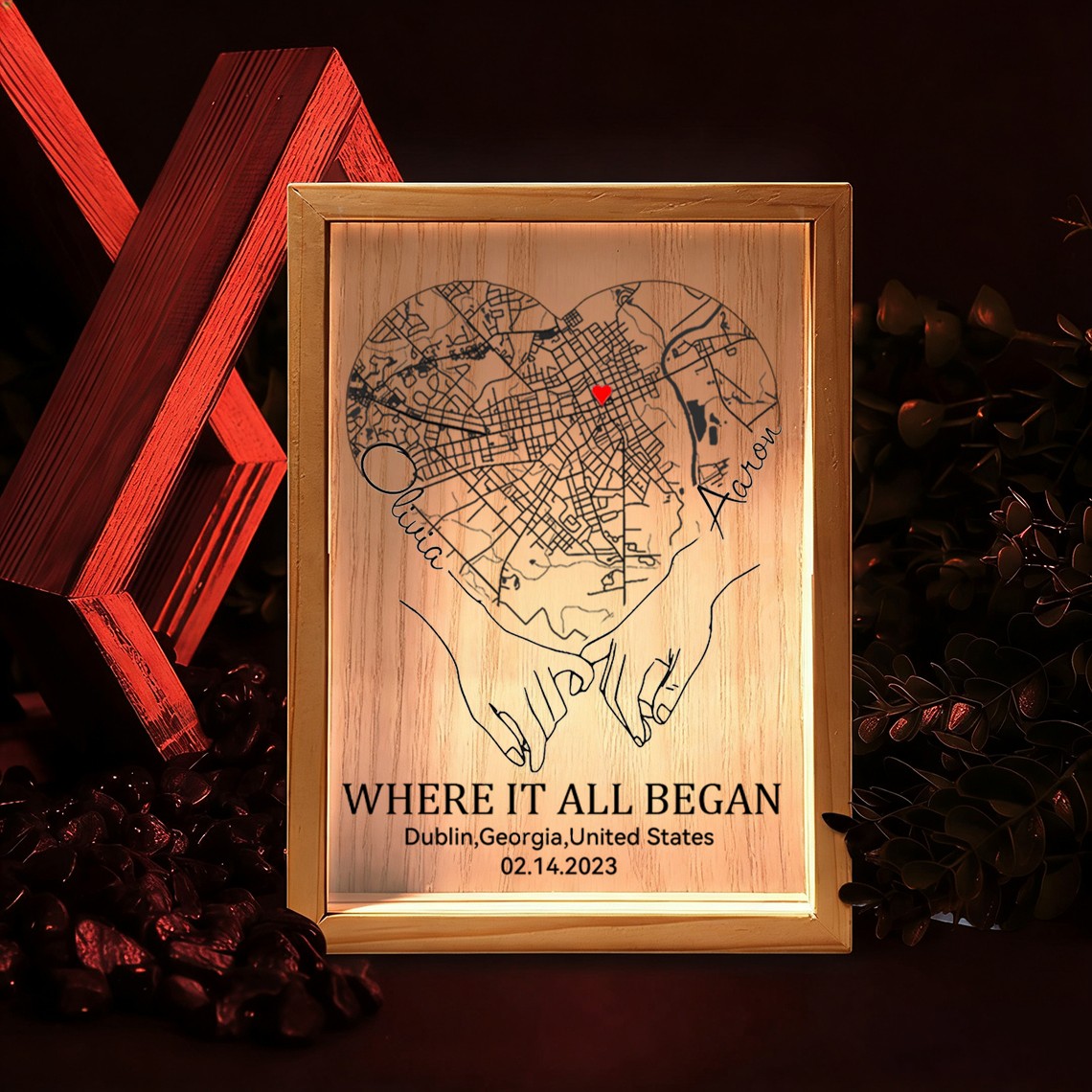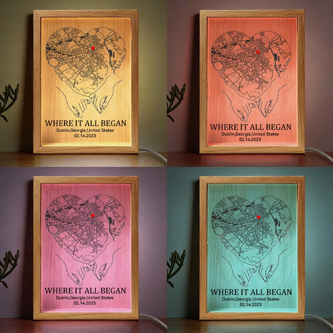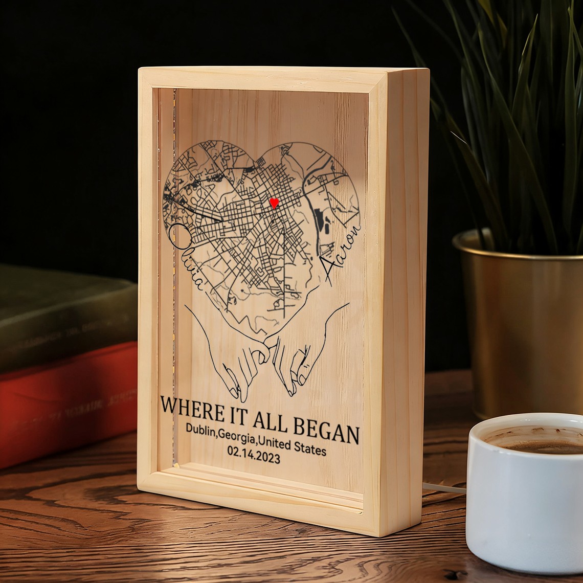 The Personalized Where It All Began Map Light Box for Couple turns a meaningful location into a warm and eye catching display. Featuring a custom map design that highlights the place your story began, this light box transforms a special memory into a timeless piece of home décor. Made with a clear acrylic panel and a natural wood base, it adds a modern and elegant touch to bedrooms, desks, and living spaces. The print appears on one side with a soft mirrored reflection on the back, creating a clean and layered visual effect.
