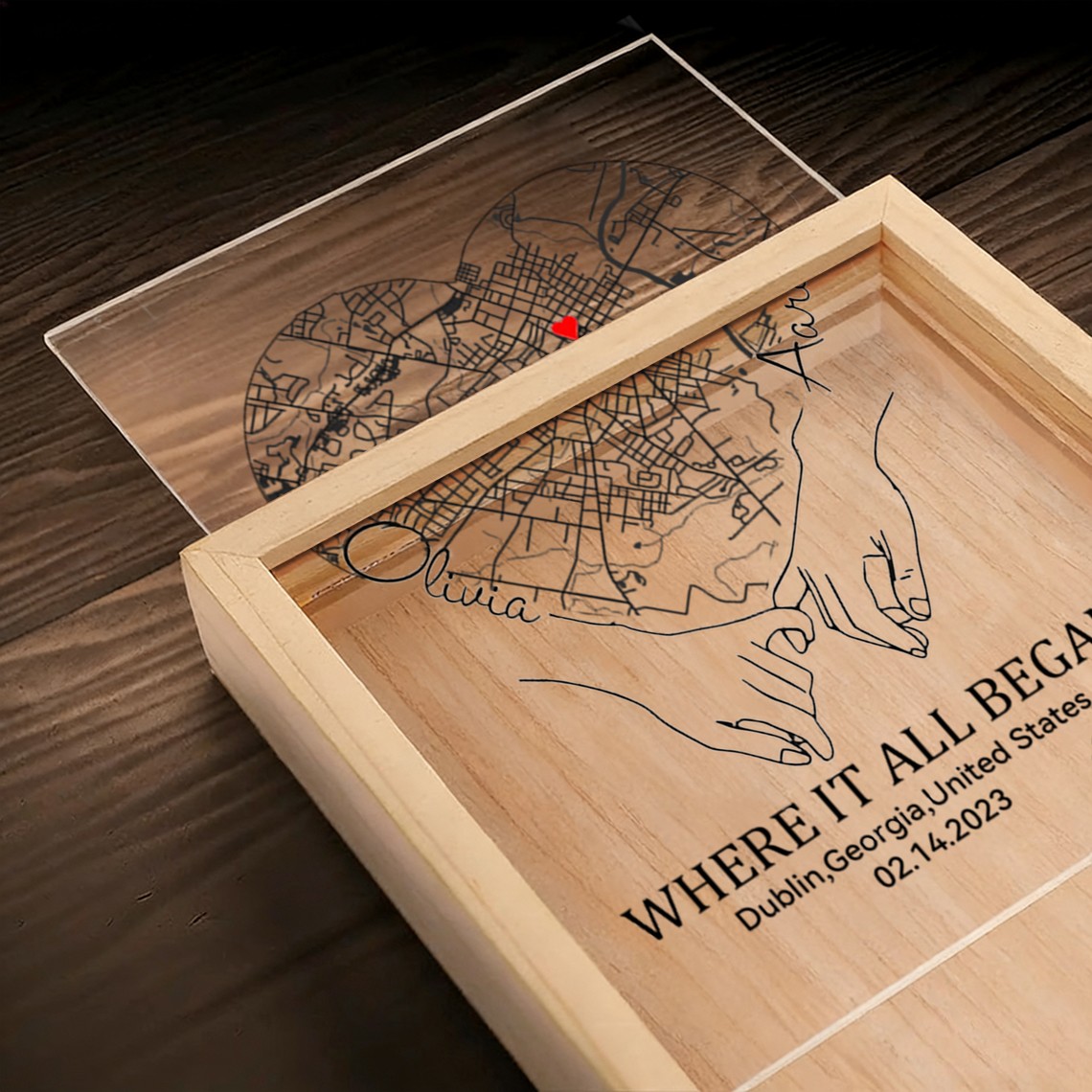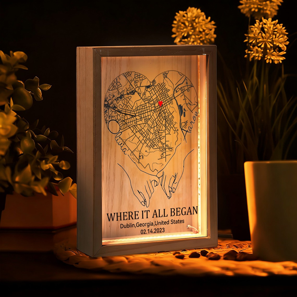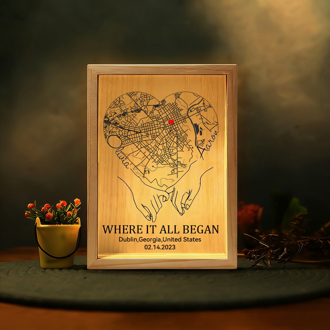 The Personalized Where It All Began Map Light Box for Couple turns a meaningful location into a warm and eye catching display. Featuring a custom map design that highlights the place your story began, this light box transforms a special memory into a timeless piece of home décor. Made with a clear acrylic panel and a natural wood base, it adds a modern and elegant touch to bedrooms, desks, and living spaces. The print appears on one side with a soft mirrored reflection on the back, creating a clean and layered visual effect.
